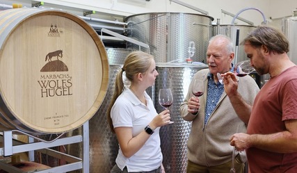 Bei der Ausbildung hat Hubert Marbach auch die Nachfolge im Blick. „Wir haben mit Stefan Bönsch einen hervorragenden Kellermeister für unseren Betrieb eingestellt, der dieses Weinwissen beherrscht. Gleichzeitig nutzten wir ein Ausbildungsangebot über die Lehrstellenbörse der Handwerkskammer, in dem wir für eine Lehrstelle im handwerklichen Beruf der Weintechnologin warben. Der Beruf ist sehr anspruchsvoll, weil er Landwirtschaft, aber auch Biologie und Chemie und Vermarktung beinhaltet. Axinja Laubmann ist eine ganz pfiffige junge Frau, die nicht nur unterschiedlichste Fahrzeuge führen kann, sondern schon über einen Motorsägenschein verfügt. Auf unserem Weingut kann sie von Anfang an überall dabei sein, von der Weinlese, der Kelterei oder offiziellen Verkostung. Dieser Beruf ist mehr wissenschaftlich geworden. Die Hochschule Geisenheim bietet den Bachelor-Studiengang oder die Promotion an“, berichtet der Weingut-Besitzer.